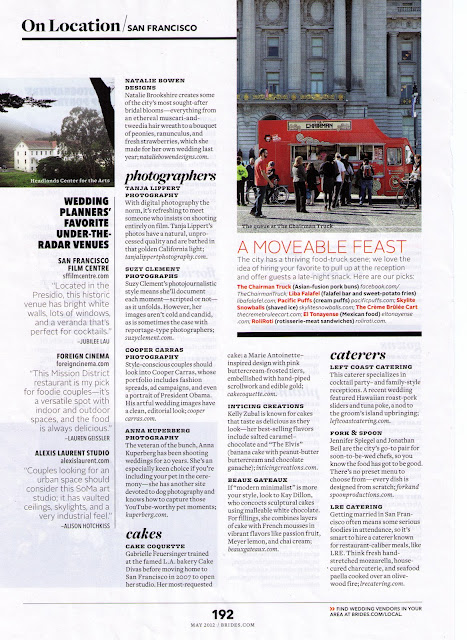 If you're considering San Francisco as the destination for your wedding, the newest issue of BRIDES magazine just came out on newsstands, with a section focused on planning your nuptials in San Francisco. We're humbled to be listed on their short list of Planners to call, with our partner in crime Gloria Wong, and amongst some of our favorite vendor friends in the Bay Area!